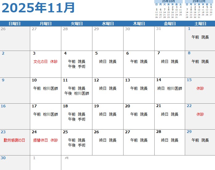 誠に勝手ながら、2025年11月11日(火曜)午後の診察担当医が下記の通り変更となります。